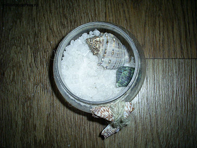 Насыпаем соль в баночку и кладем ракушкиБерем морскую соль, насыпаем ее в баночку, красиво размещаем ракушки.