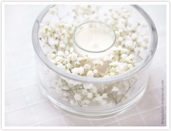 Для гипсофилы или других растений: желательно формировать из веточек венкобразную форму вокруг свечи. Т.е. прятать стебли внутрь, а цветы поворачивать к внешней части вазы. Также очень красиво смотрится, если "декор" не слишком плотный и может пропускать свет.