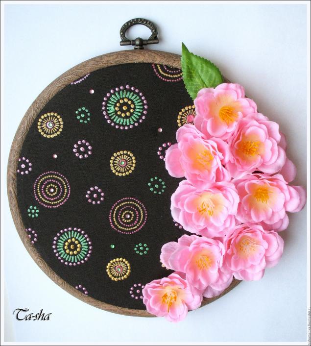 Здесь использованы те же пяльцы (только меньшего диаметра), роспись контурами, декоративные стразы, цветы из ткани.